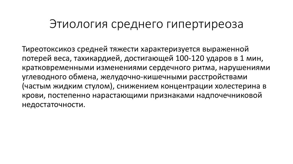 Этиология среднего гипертиреозаТиреотоксикоз средней тяжести характеризуется выраженной