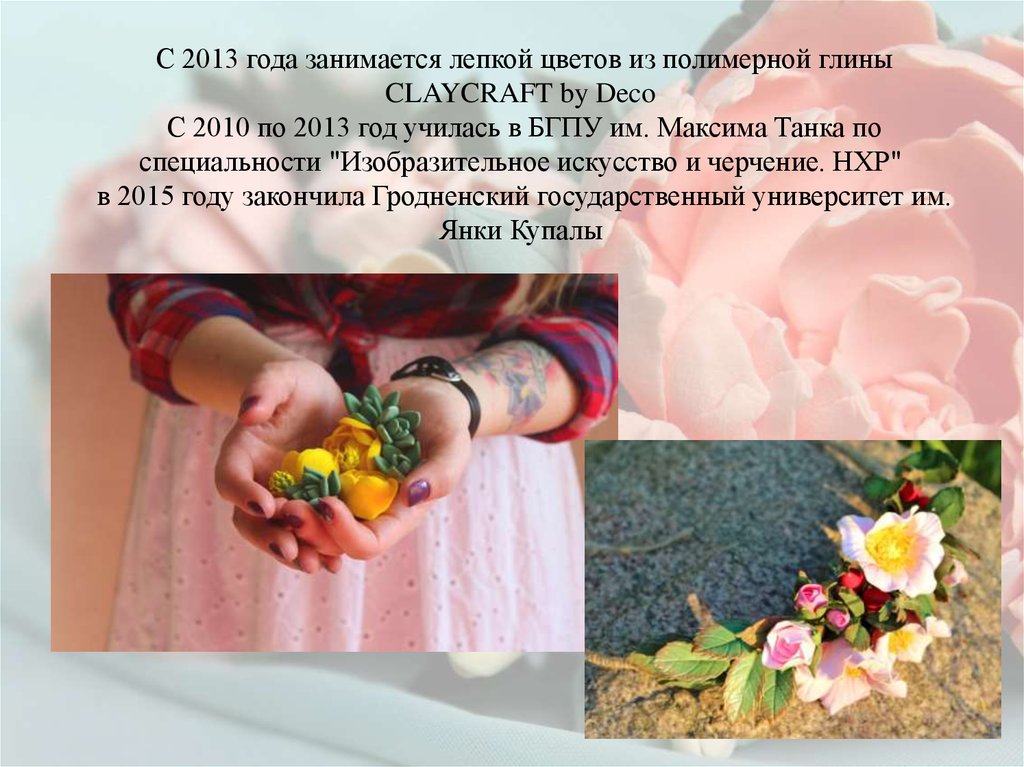 С 2013 года занимается лепкой цветов из полимерной глиныCLAYCRAFT by Deco