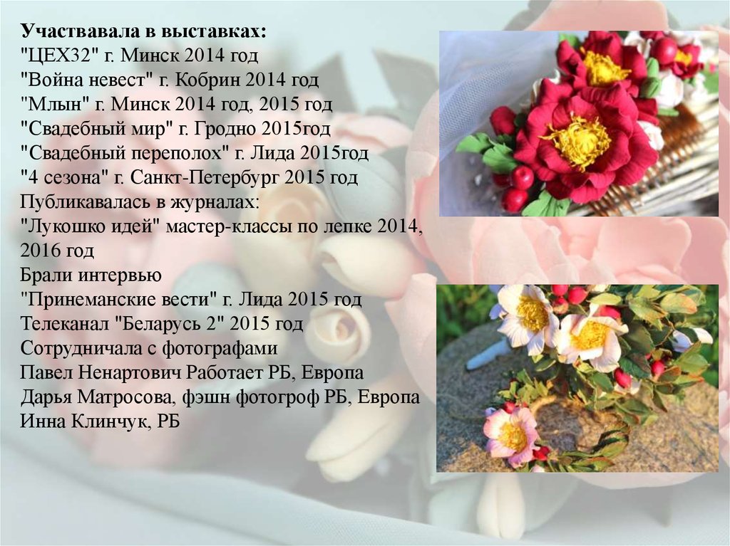 Участвавала в выставках:"ЦЕХ32" г. Минск 2014 год