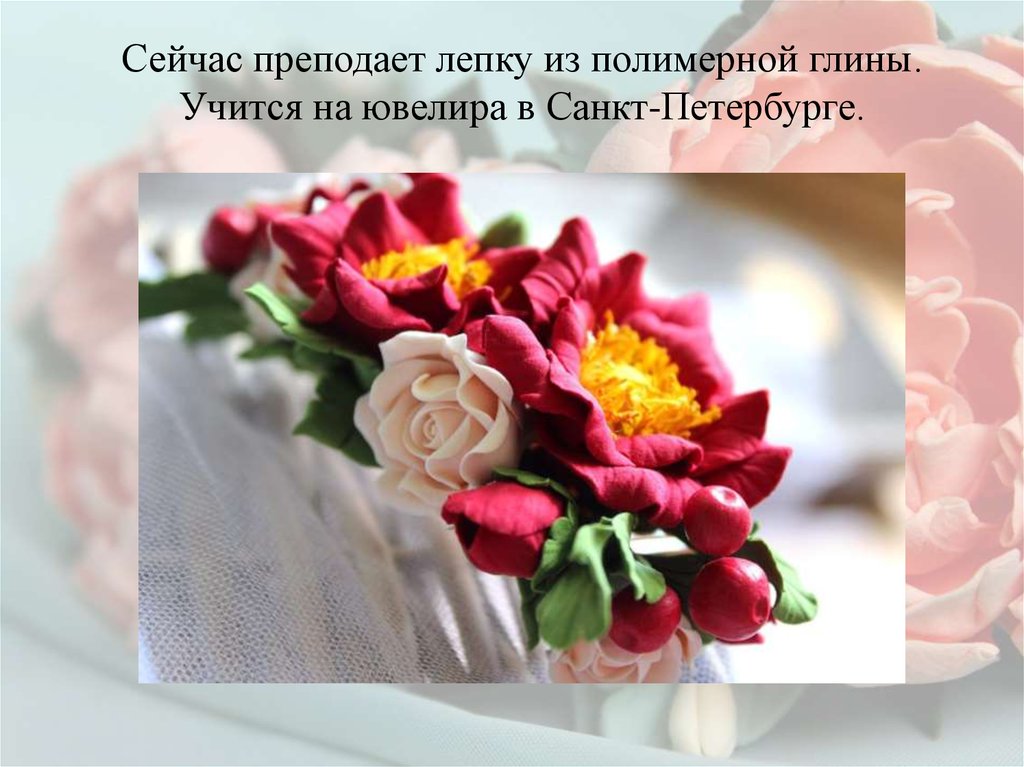 Сейчас преподает лепку из полимерной глины.Учится на ювелира в Санкт-Петербурге.