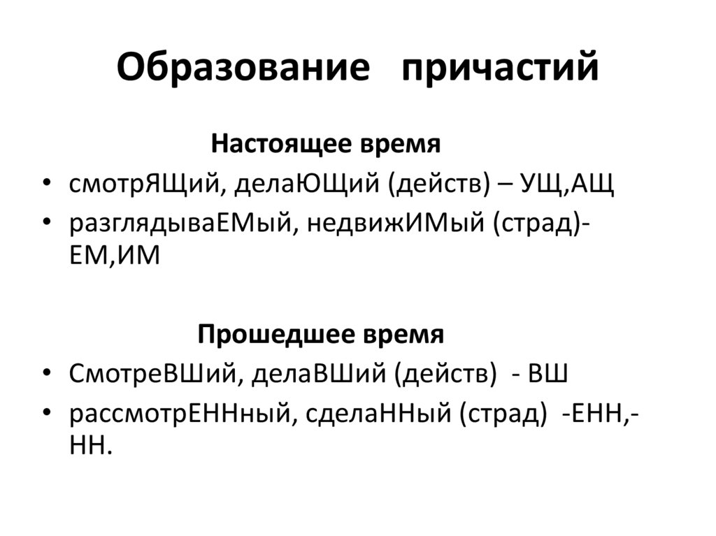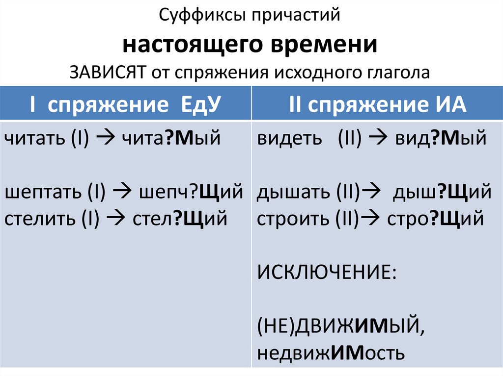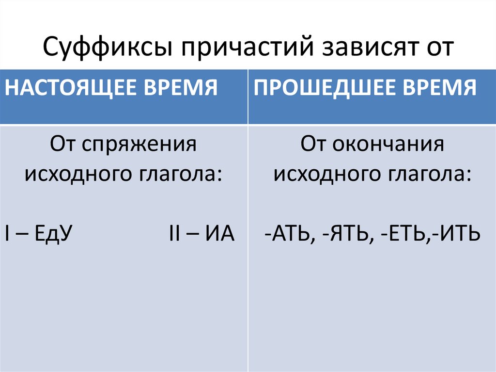 Суффиксы причастий зависят отНАСТОЯЩЕЕ ВРЕМЯ