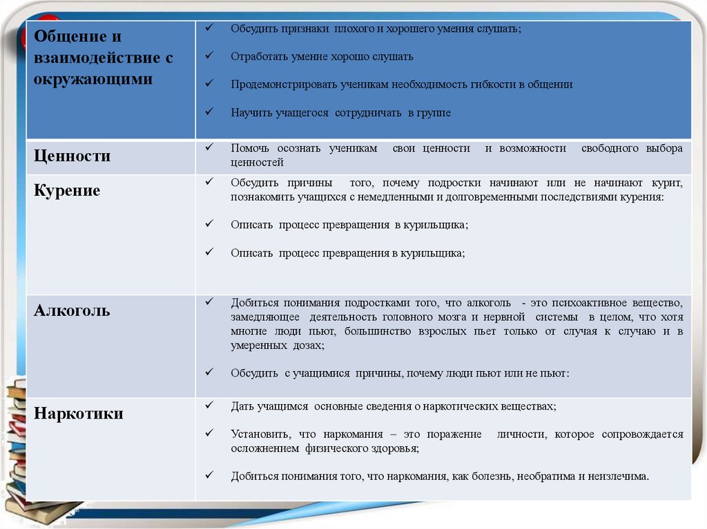 - формирование адекватной самооценки, формированиенавыков принятия решения, умения сказать «нет», умения