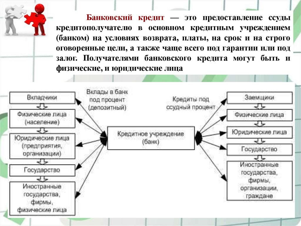 Банковский кредит — это предоставление ссудыкредитополучателю в основном кредитным учреждением