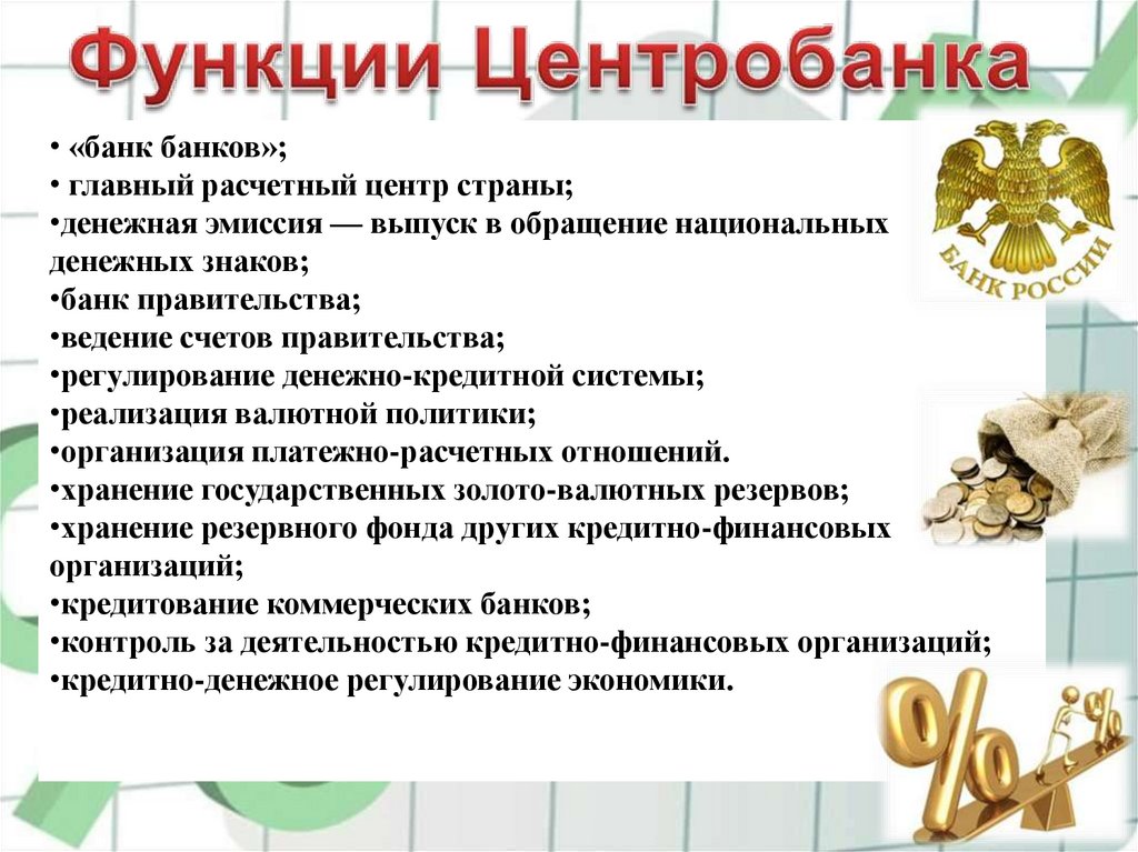 Центральный банк Российской Федерации (Банк России) —главный банк первого уровня, главный эмиссионный, денежнокредитный институт Российской Федерации, разрабатывающий и