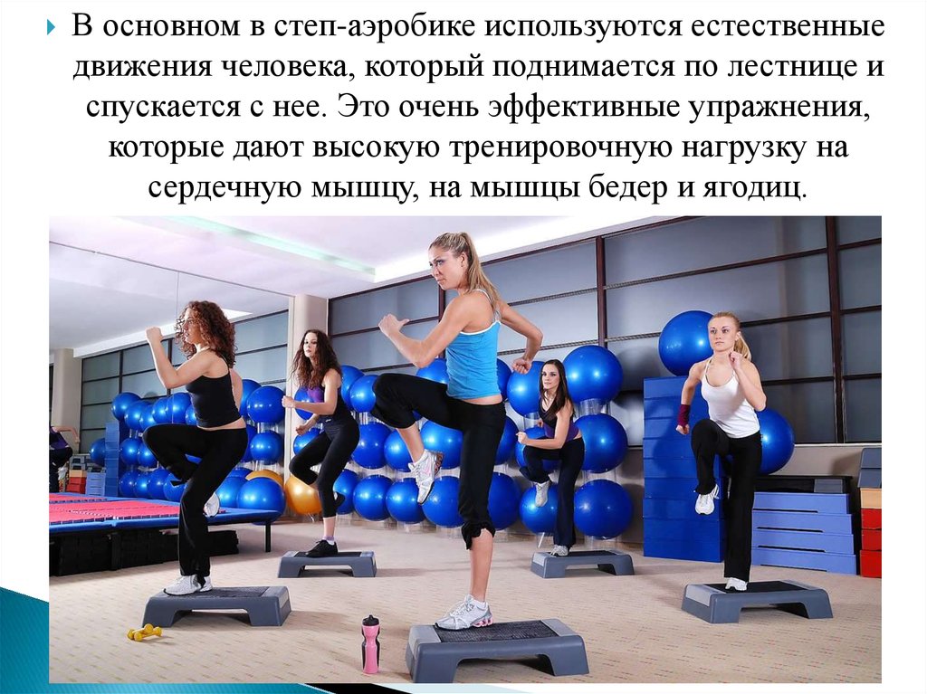 В основном в степ-аэробике используются естественныедвижения человека, который поднимается по лестнице и