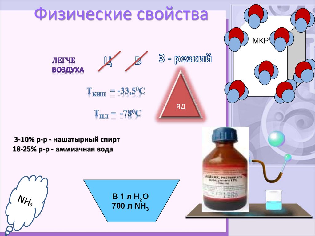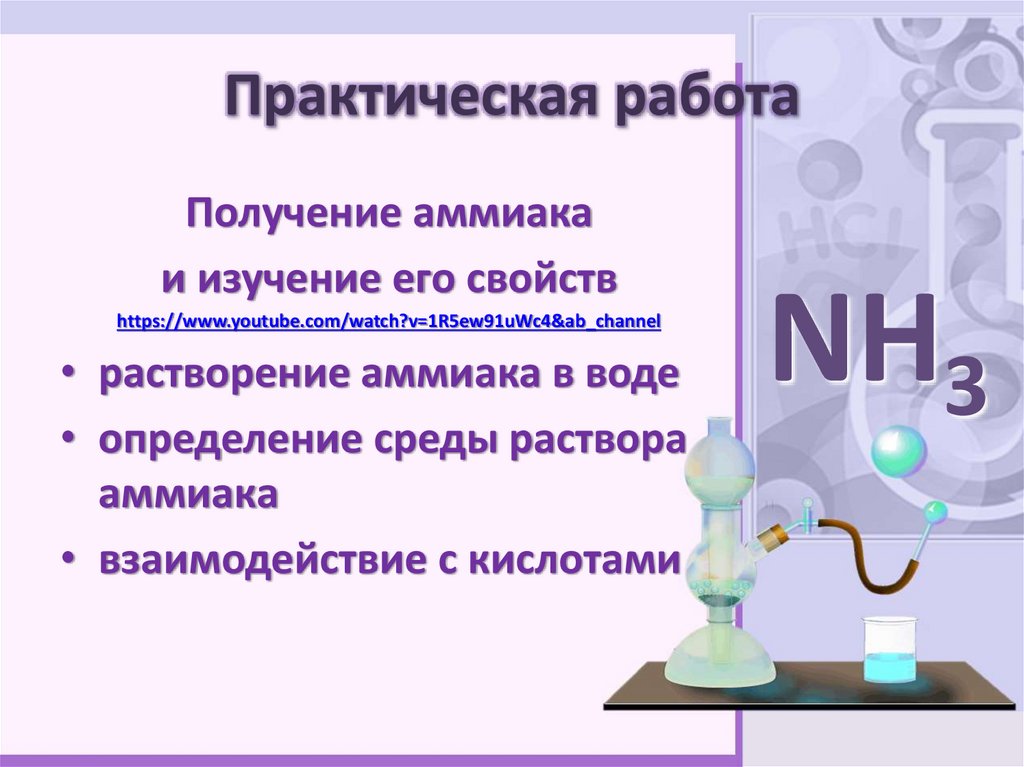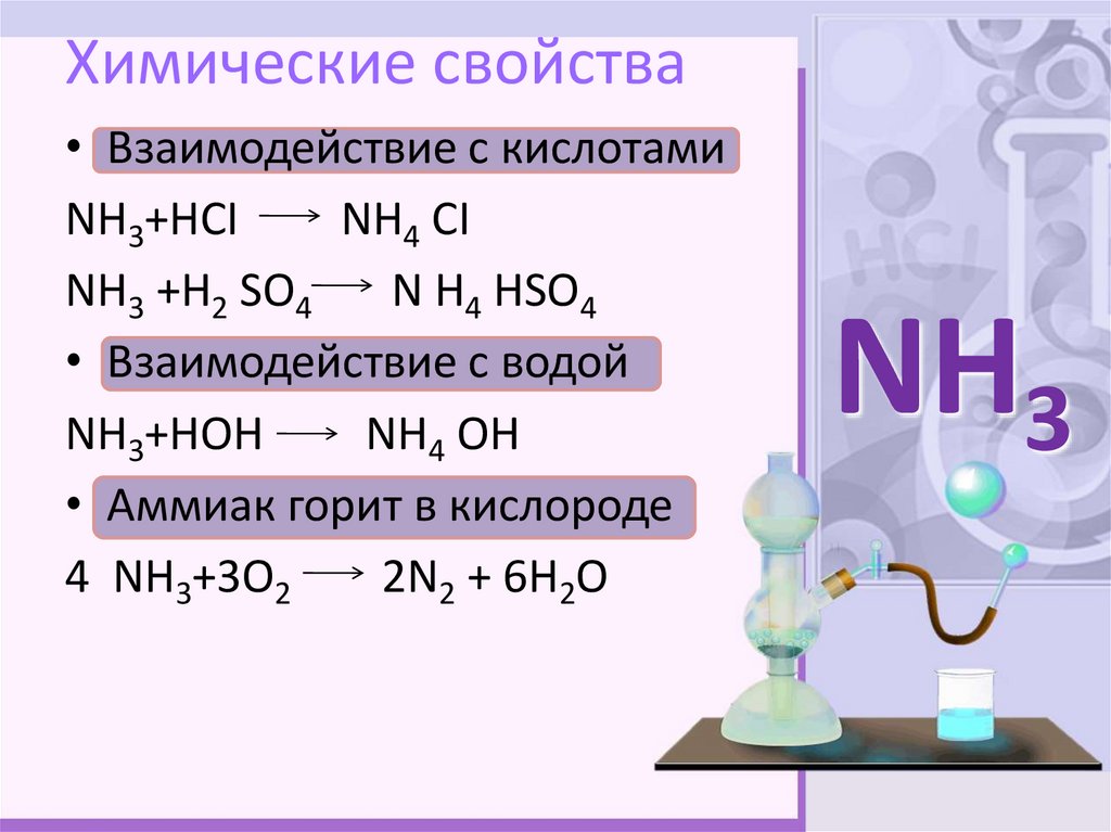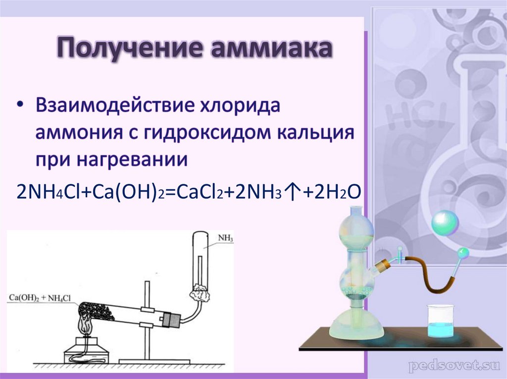 Получение аммиака2NH4Cl+Ca(OH)2=CaCl2+2NH3↑+2H2O