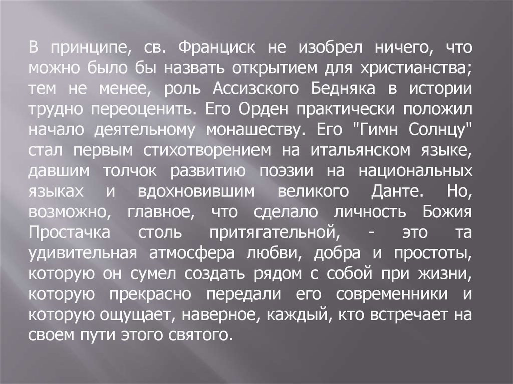 В принципе, св. Франциск не изобрел ничего, чтоможно было бы назвать открытием для христианства;