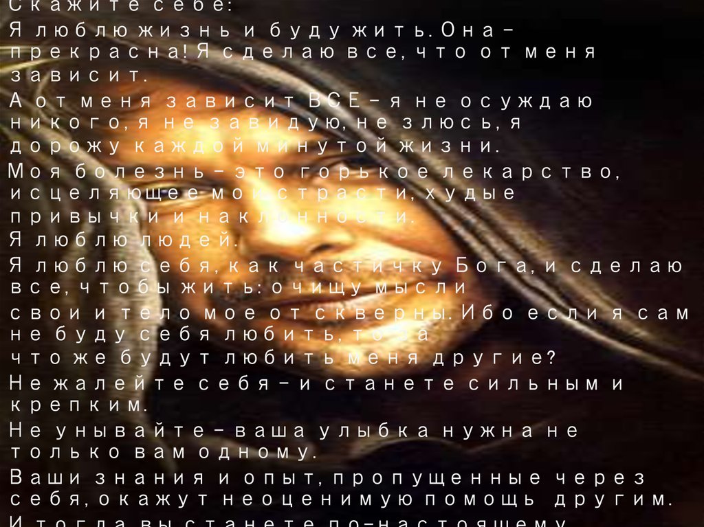 Скажите себе:Я люблю жизнь и буду жить. Она прекрасна! Я сделаю все, что от меня