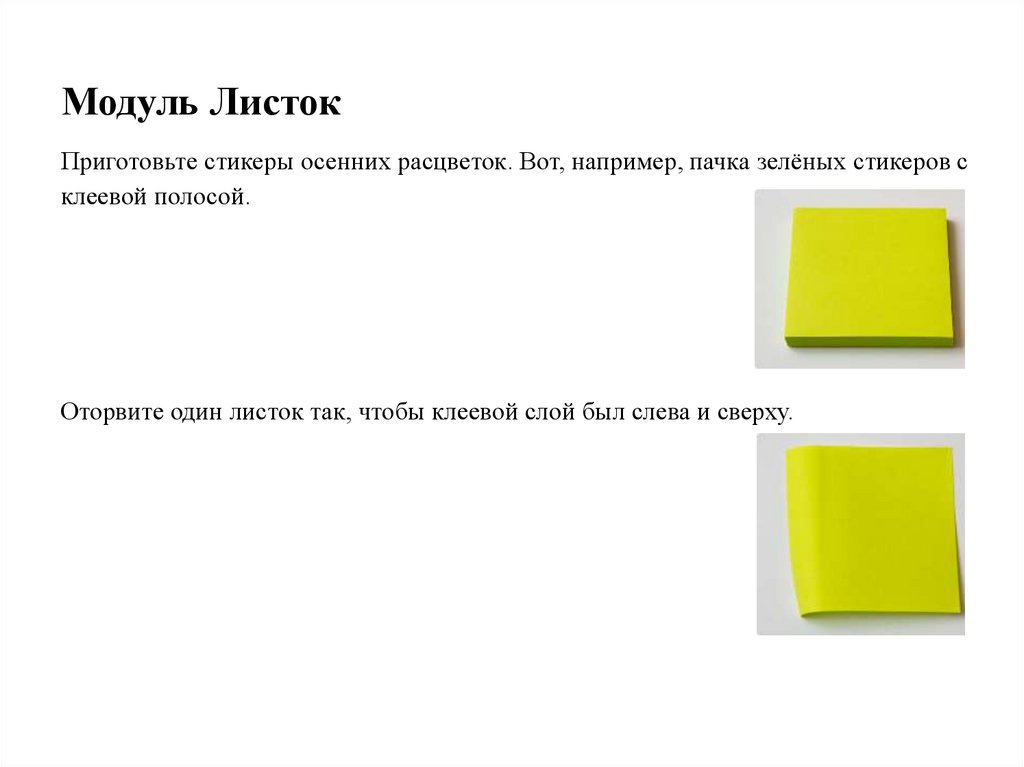 Модуль ЛистокПриготовьте стикеры осенних расцветок. Вот, например, пачка зелёных стикеров с