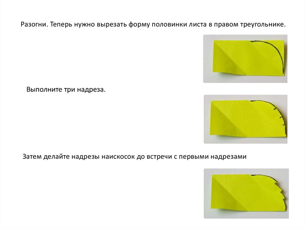 Разогни. Теперь нужно вырезать форму половинки листа в правом треугольнике.Выполните три надреза.