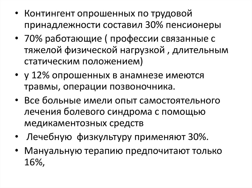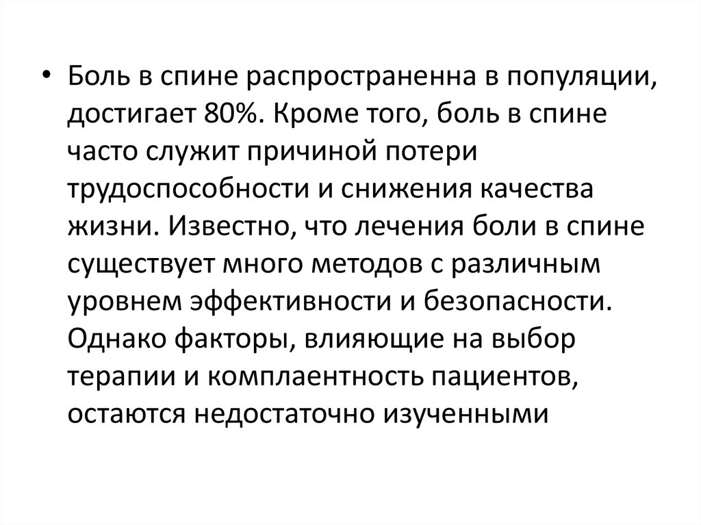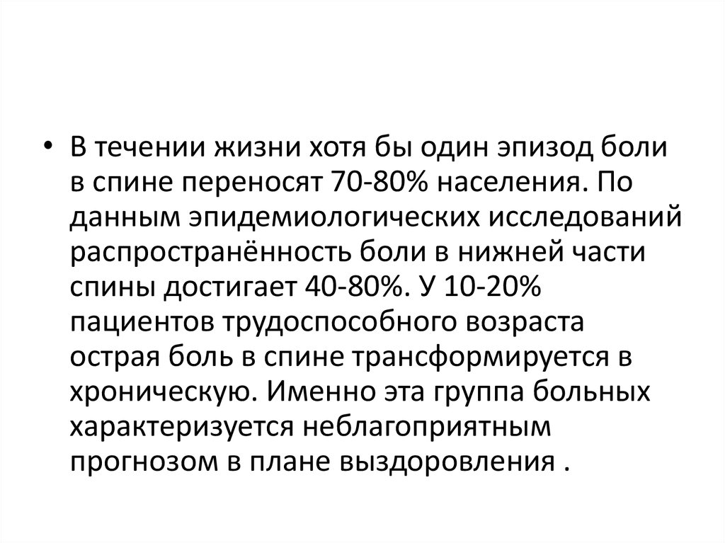 • Боль в спине распространенна в популяции,достигает 80%. Кроме того, боль в спине