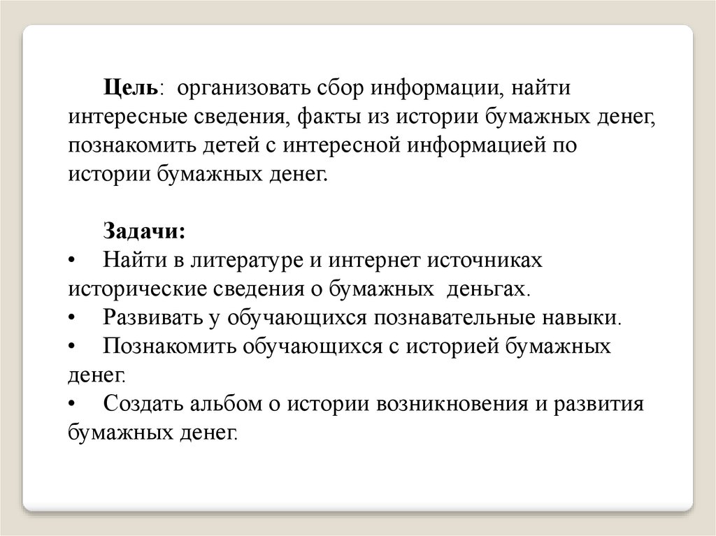 Цель: организовать сбор информации, найтиинтересные сведения, факты из истории бумажных денег,