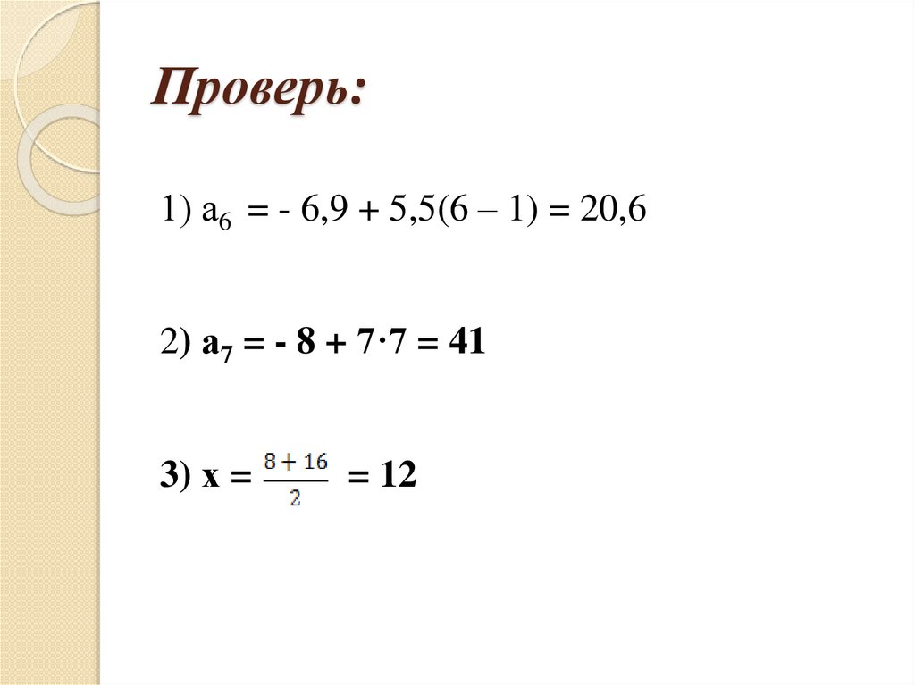 Проверь:1) а6 = - 6,9 + 5,5(6 – 1) = 20,6