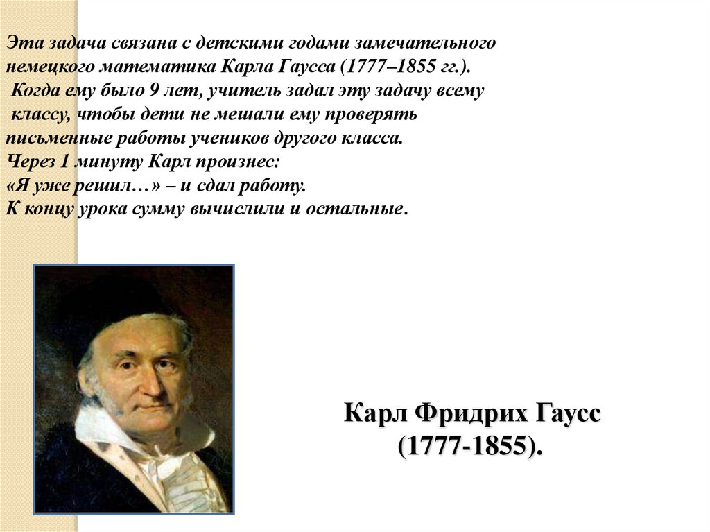 Эта задача связана с детскими годами замечательногонемецкого математика Карла Гаусса (1777–1855 гг.).