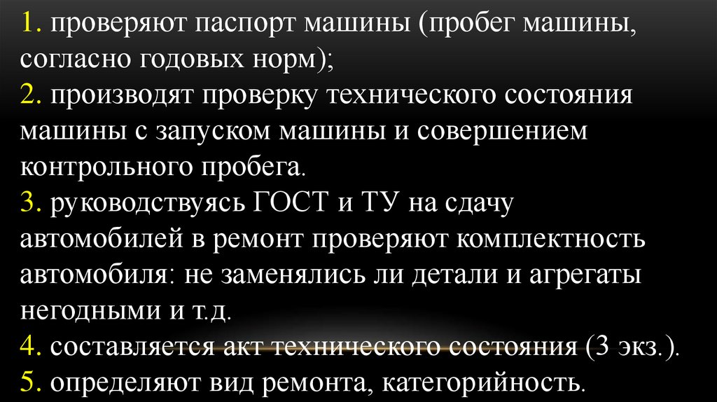1. проверяют паспорт машины (пробег машины,согласно годовых норм);