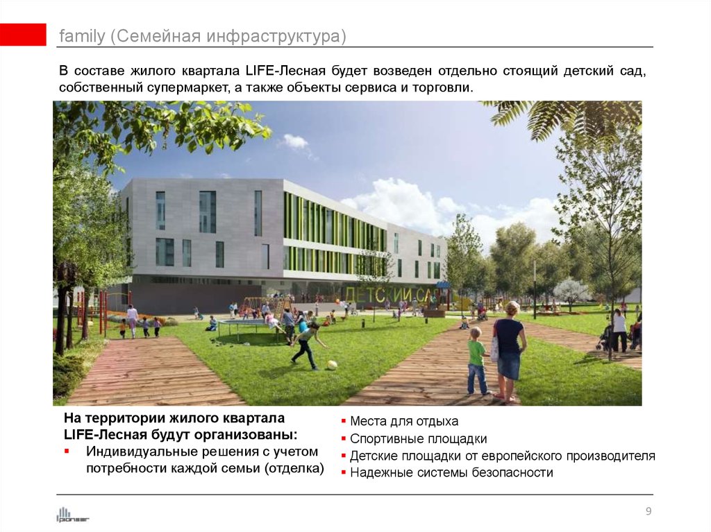 family (Семейная инфраструктура)В составе жилого квартала LIFE-Лесная будет возведен отдельно стоящий детский сад,