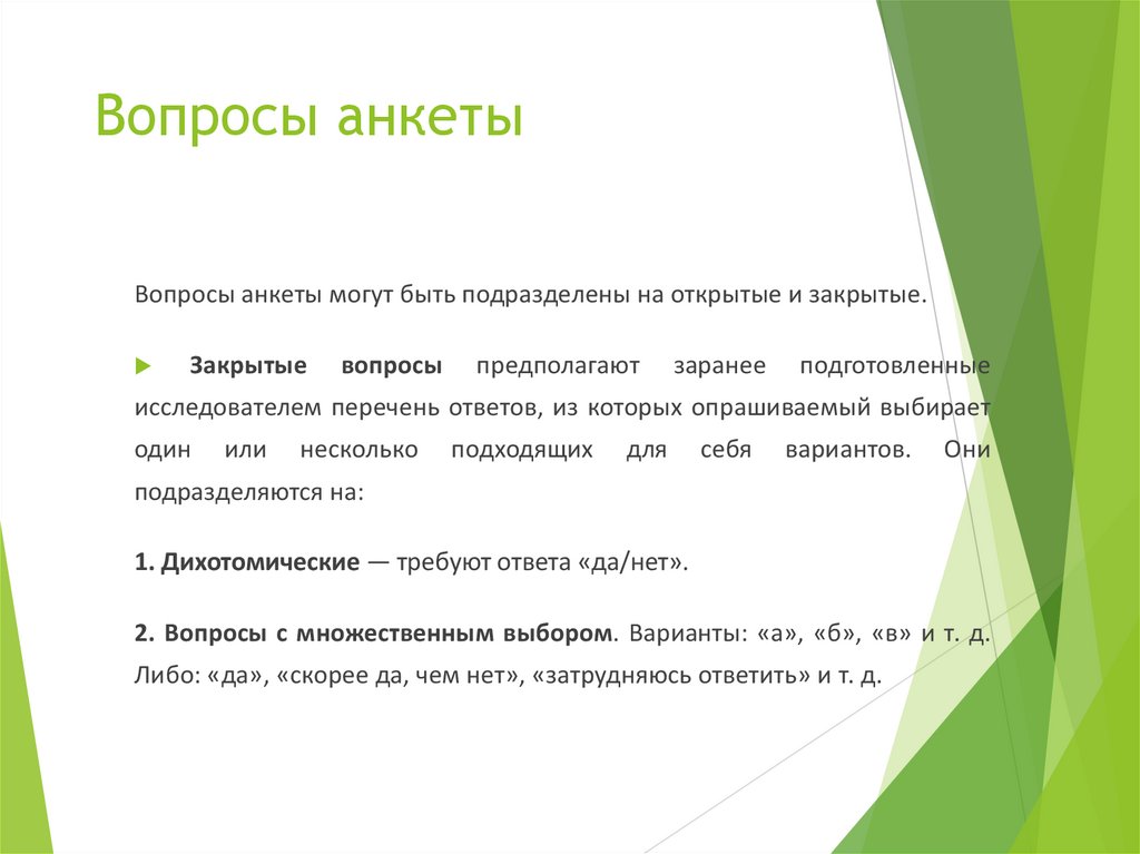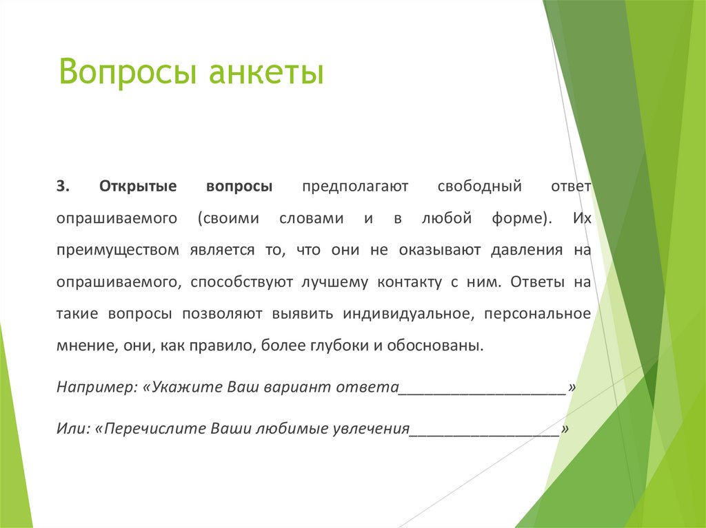 Вопросы анкетыВопросы анкеты могут быть подразделены на открытые и закрытые.