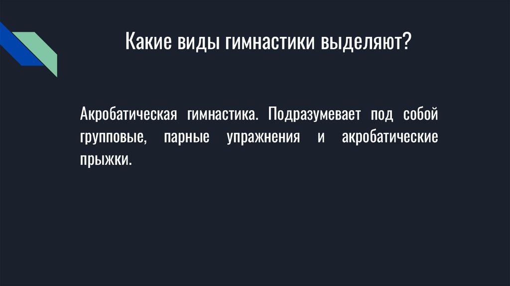 Какие виды гимнастики выделяют?Акробатическая гимнастика. Подразумевает под собой