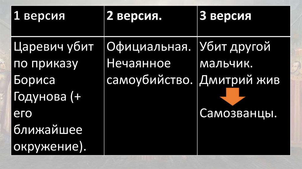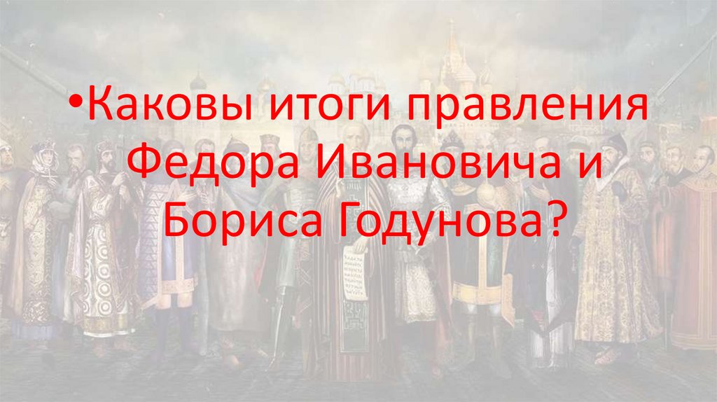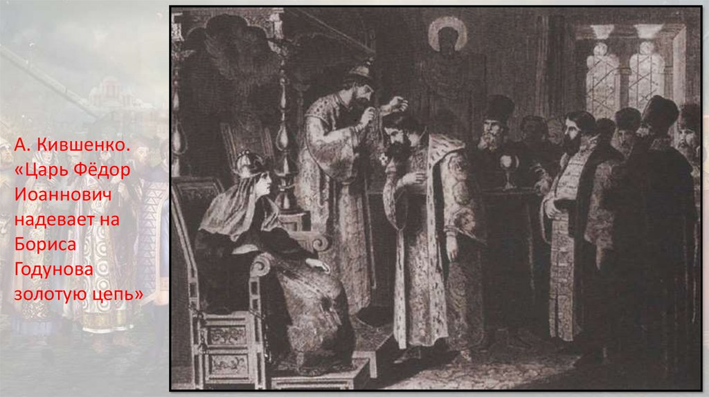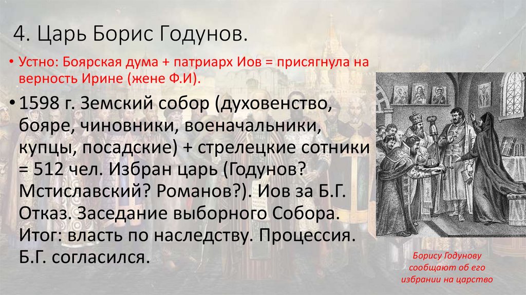 4. Царь Борис Годунов.• Устно: Боярская дума + патриарх Иов = присягнула на