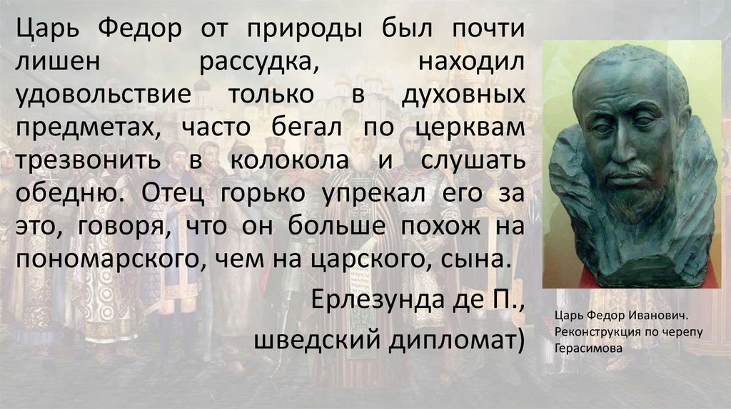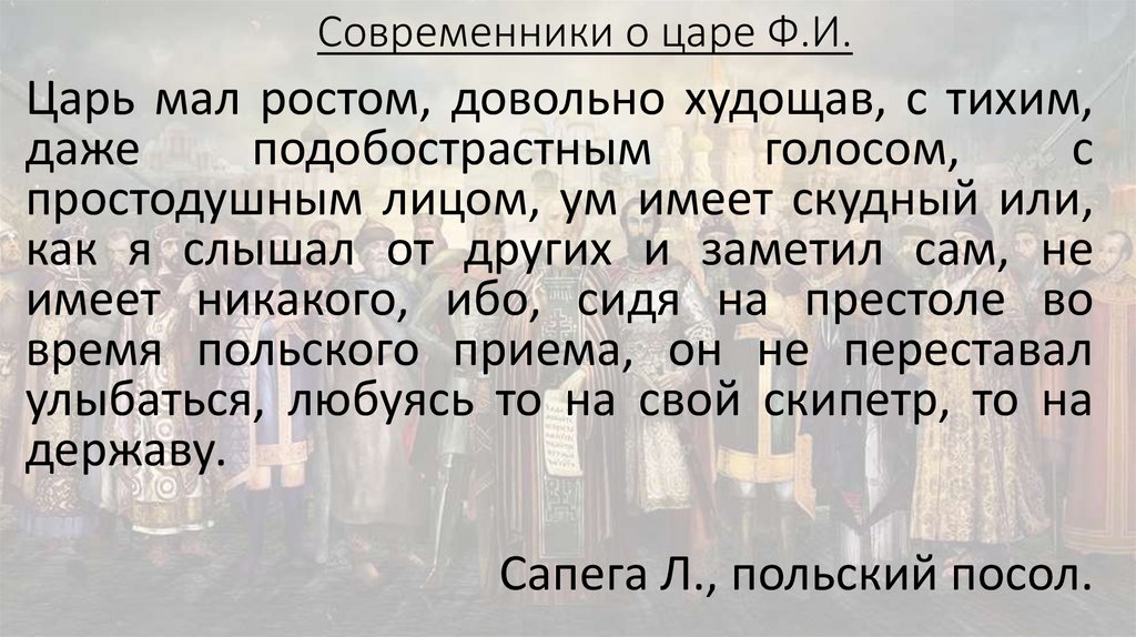 Современники о царе Ф.И.Царь мал ростом, довольно худощав, с тихим,