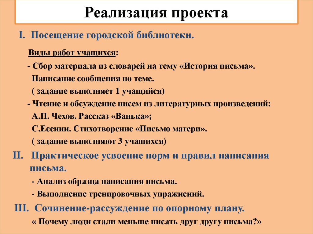 Реализация проектаI. Посещение городской библиотеки.