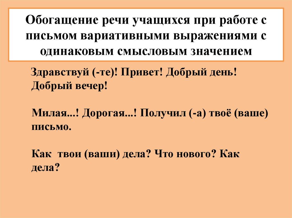 Обогащение речи учащихся при работе списьмом вариативными выражениями с