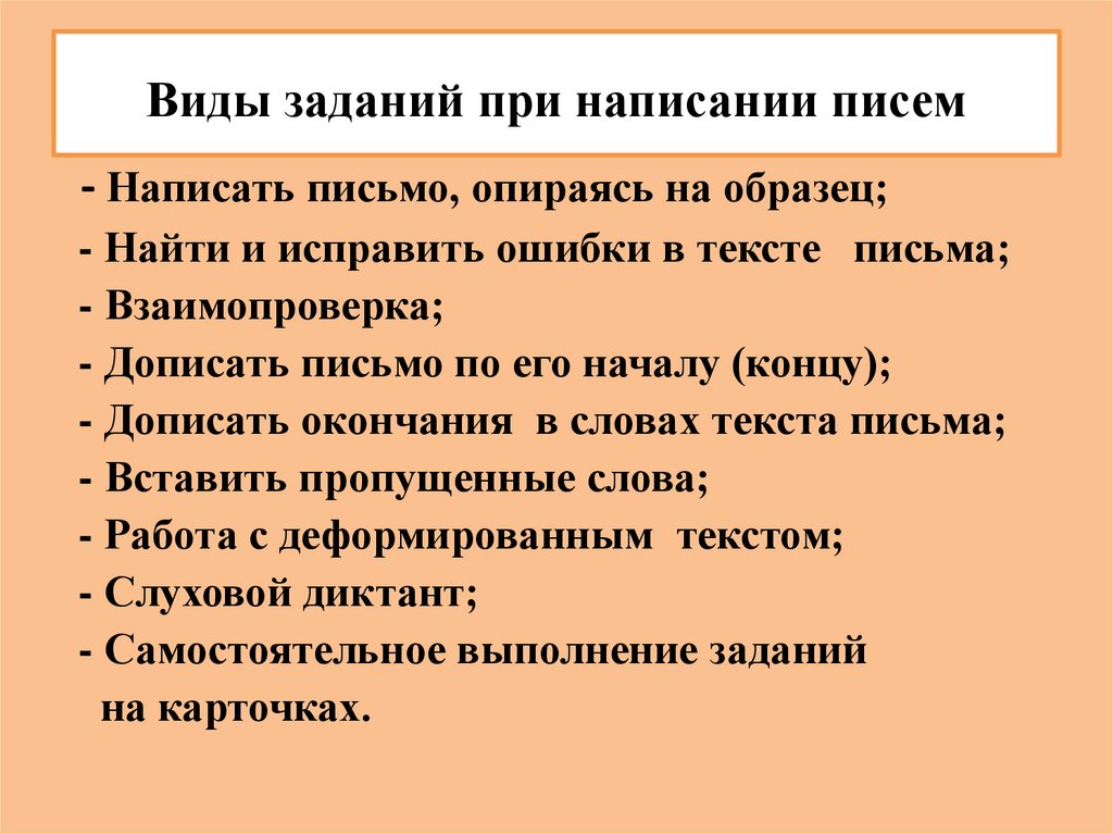 Виды заданий при написании писем- Написать письмо, опираясь на образец;