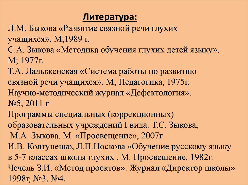 Литература:Л.М. Быкова «Развитие связной речи глухих