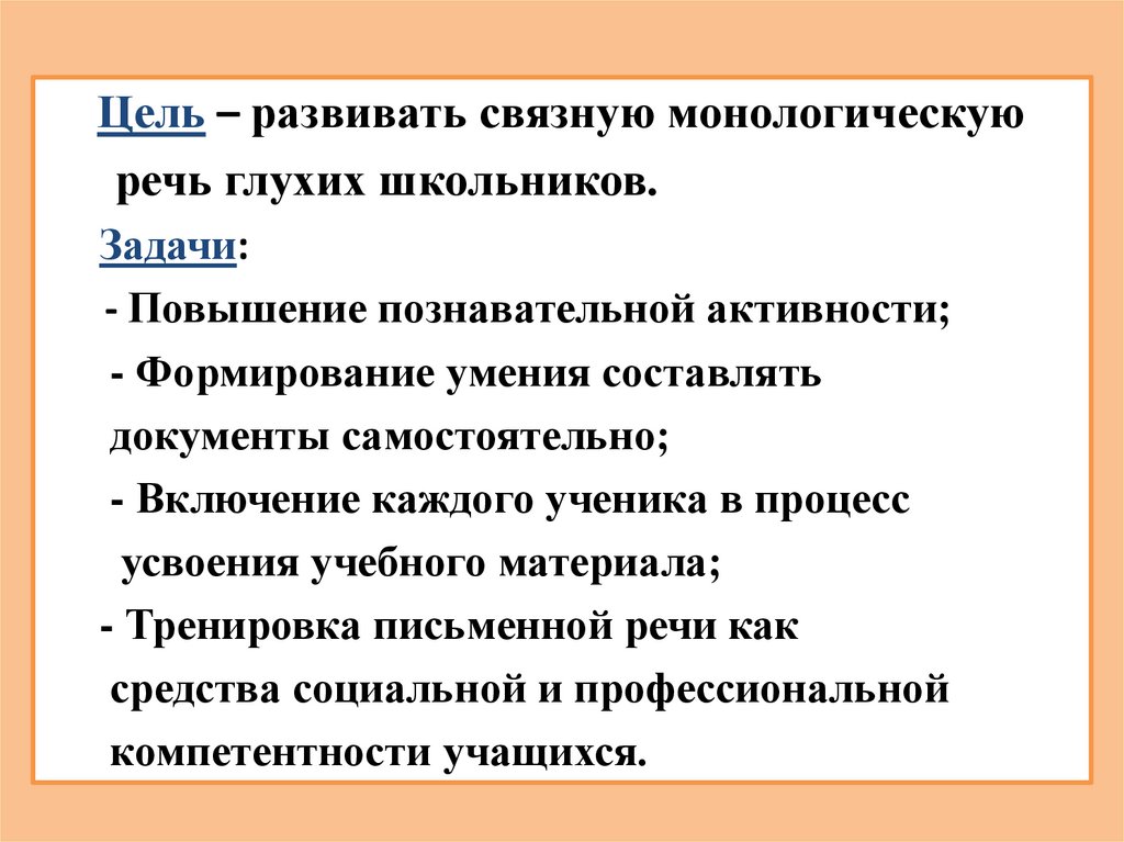Цель – развивать связную монологическуюречь глухих школьников.
