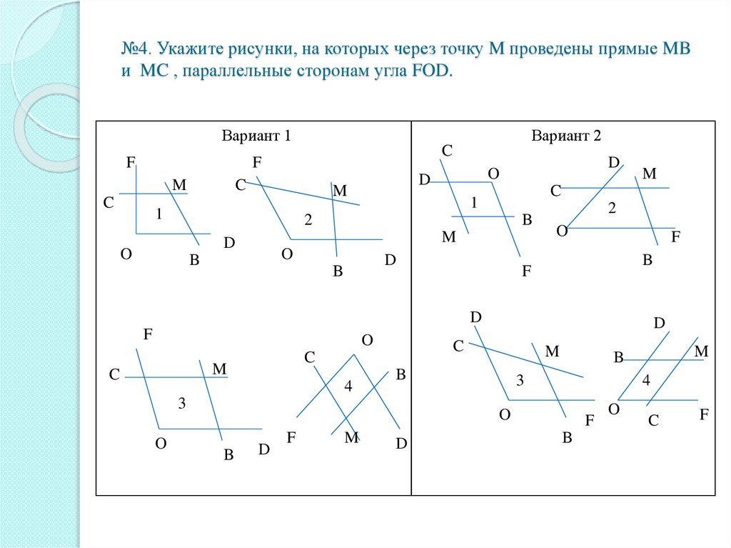№4. Укажите рисунки, на которых через точку M проведены прямые MBи MC , параллельные сторонам угла FOD.