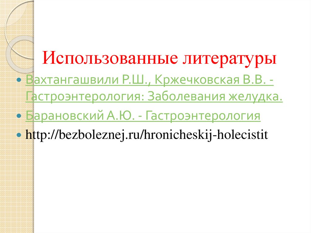 Использованные литературыВахтангашвили Р.Ш., Кржечковская В.В. Гастроэнтерология: Заболевания желудка.