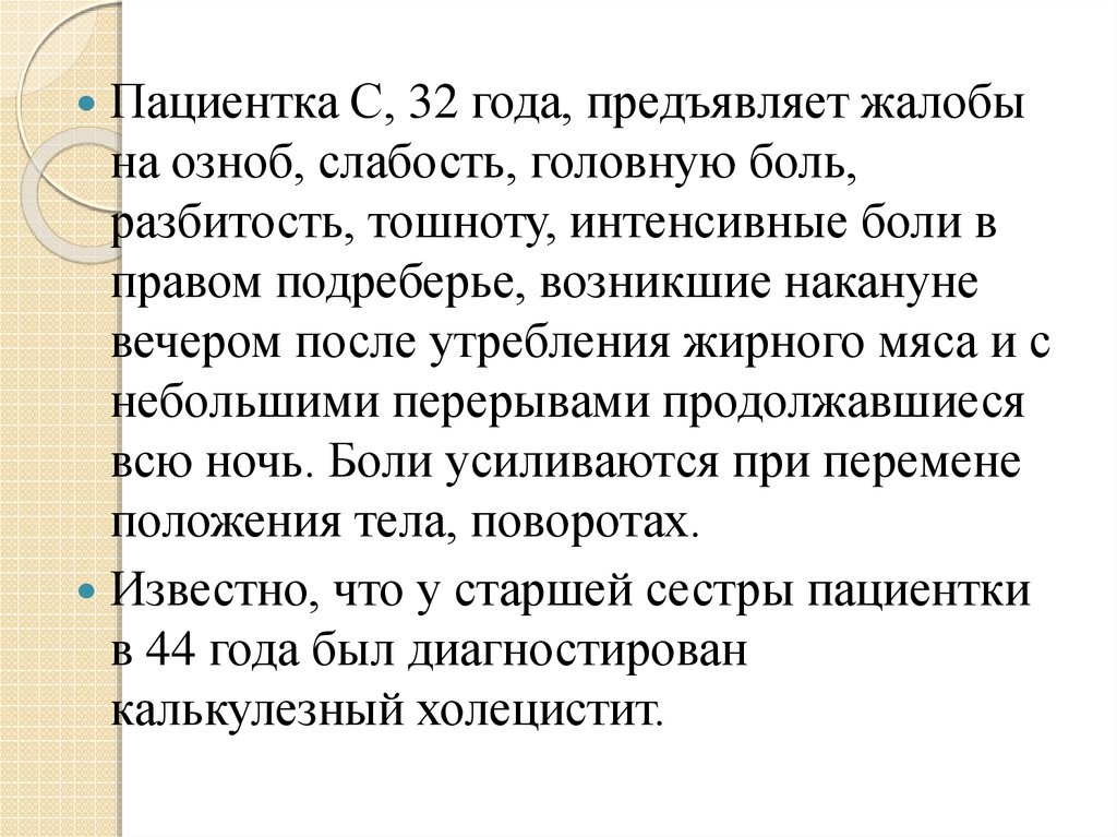Пациентка С, 32 года, предъявляет жалобына озноб, слабость, головную боль,