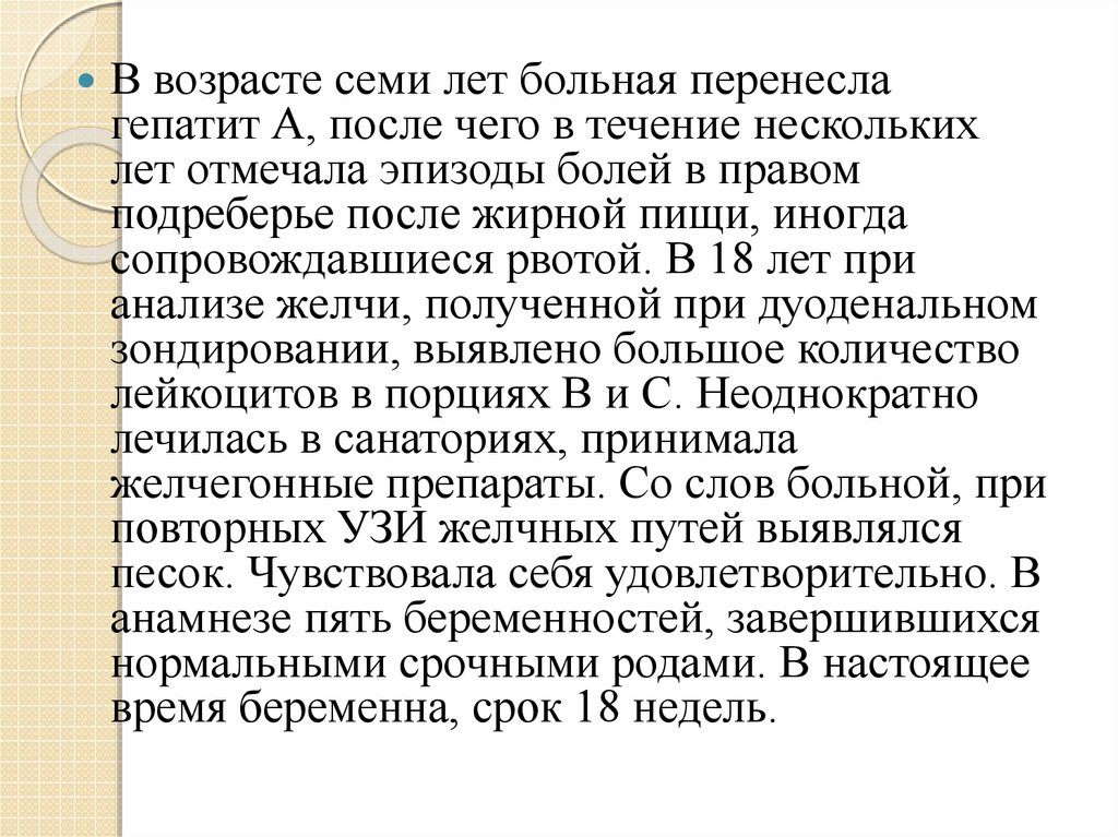В возрасте семи лет больная перенеслагепатит А, после чего в течение нескольких
