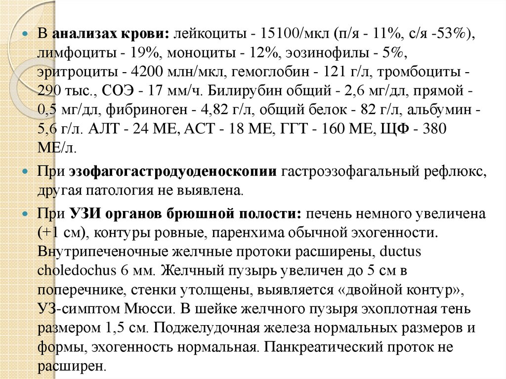 эритроциты - 4200 млн/мкл, гемоглобин - 121 г/л, тромбоциты 290 тыс., СОЭ - 17 мм/ч. Билирубин общий - 2,6 мг/дл, прямой 0,5 мг/дл, фибриноген - 4,82 г/л, общий белок - 82 г/л, альбумин 5,6 г/л. АЛТ - 24 ME, ACT - 18 ME, ГГТ - 160 ME, ЩФ - 380