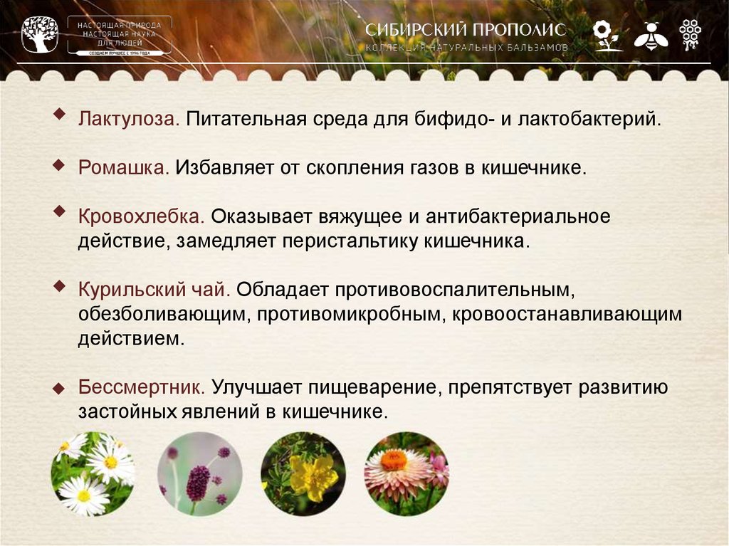 Лактулоза. Питательная среда для бифидо- и лактобактерий.Ромашка. Избавляет от скопления газов в кишечнике.