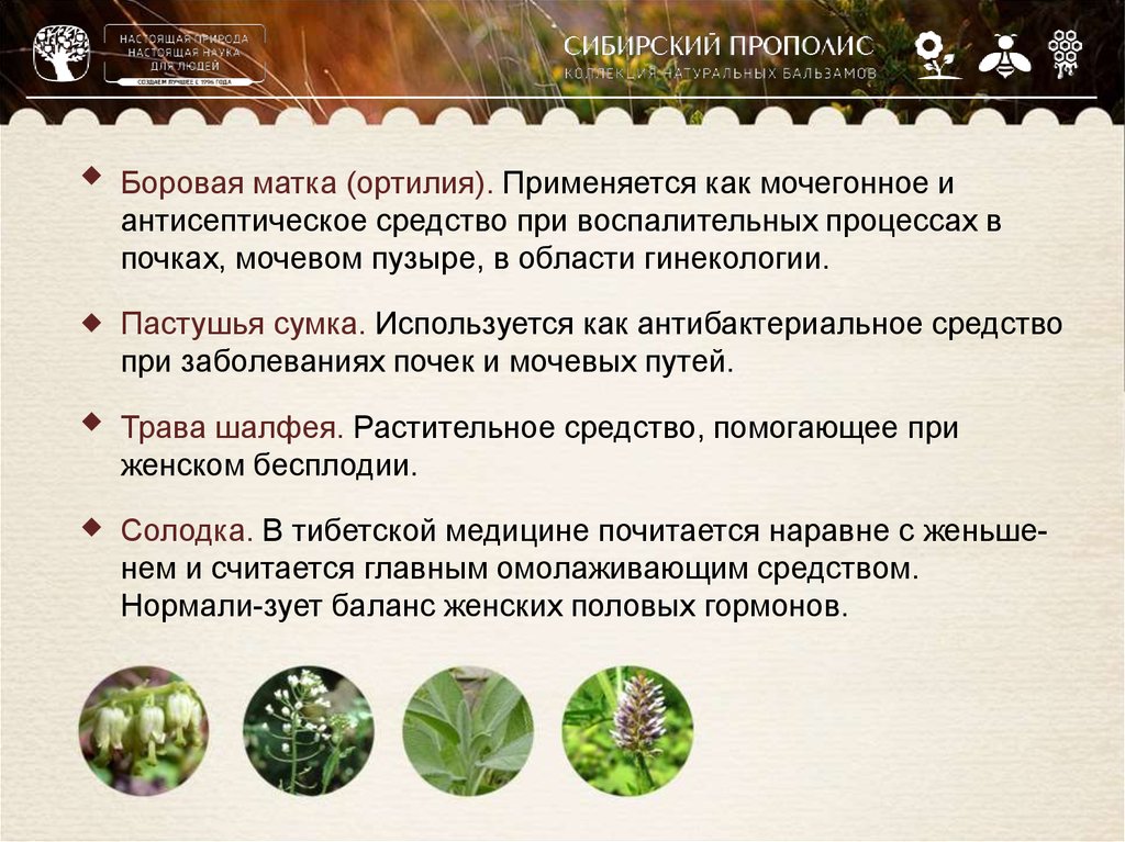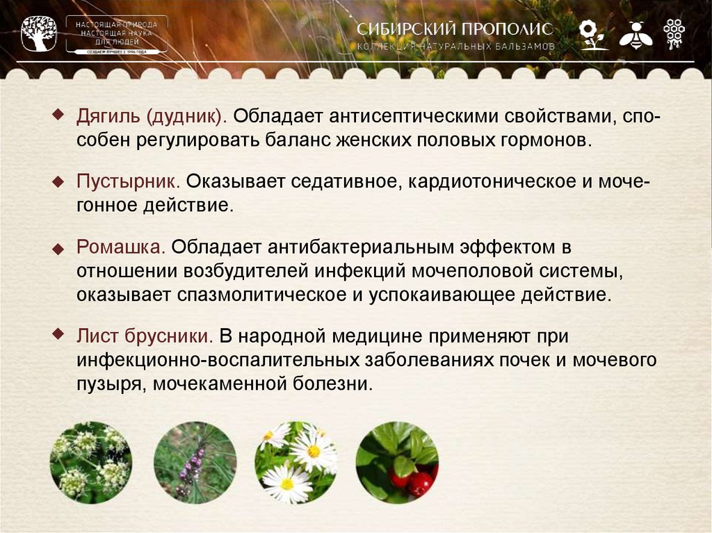Дягиль (дудник). Обладает антисептическими свойствами, способен регулировать баланс женских половых гормонов.Пустырник. Оказывает седативное, кардиотоническое и мочегонное действие.