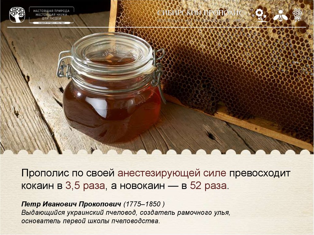 Прополис по своей анестезирующей силе превосходиткокаин в 3,5 раза, а новокаин — в 52 раза.