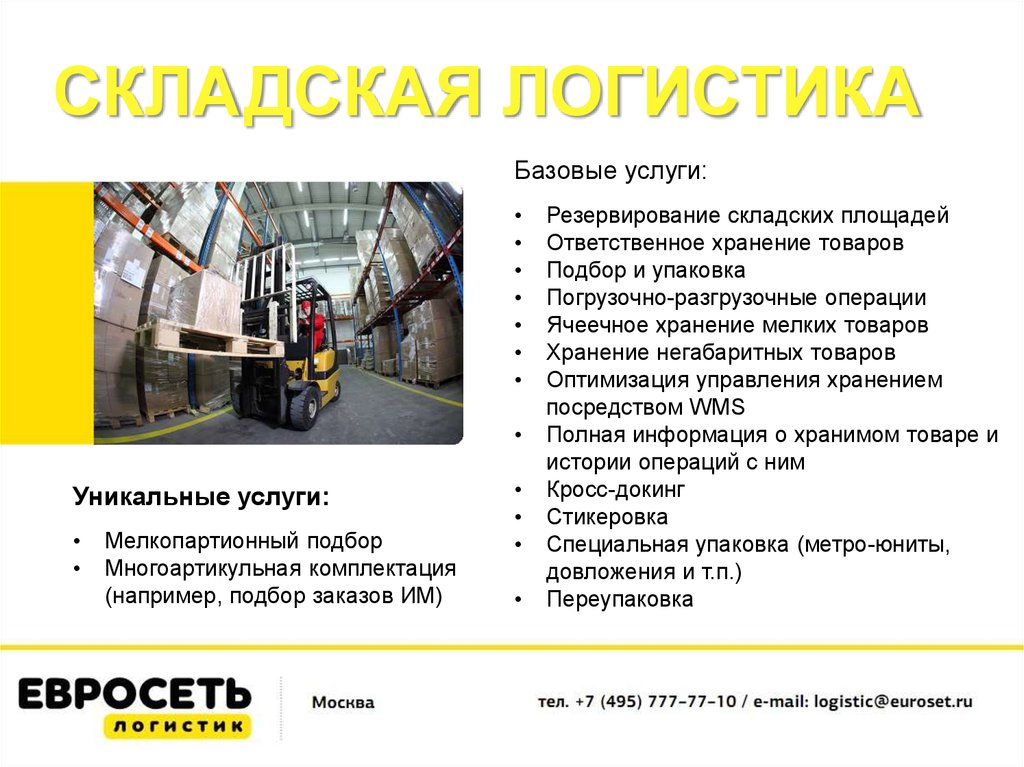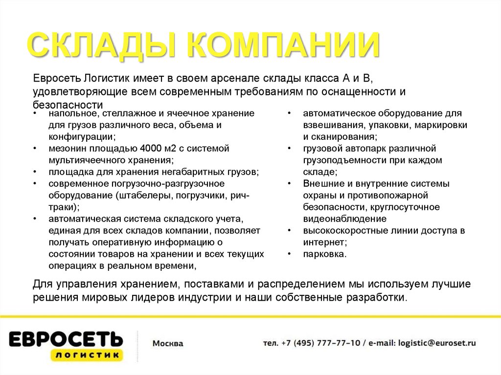СКЛАДЫ КОМПАНИИЕвросеть Логистик имеет в своем арсенале склады класса А и В,