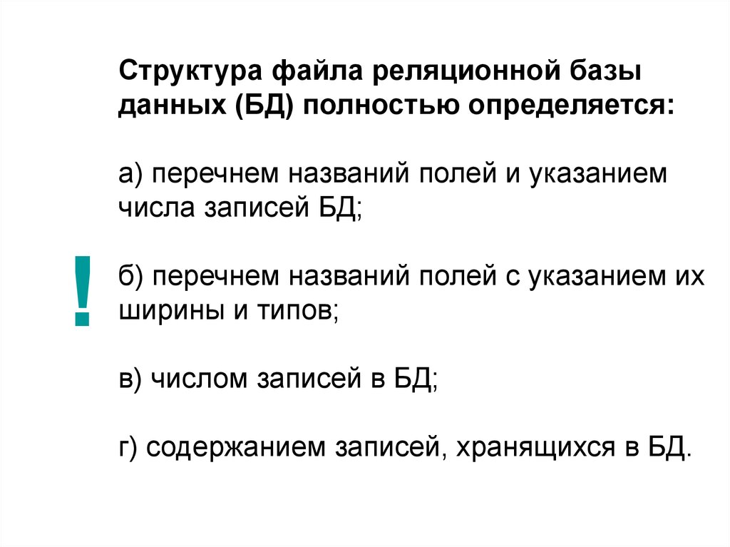 Структура файла реляционной базыданных (БД) полностью определяется: