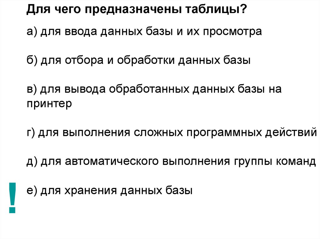 Для чего предназначены таблицы?а) для ввода данных базы и их просмотра