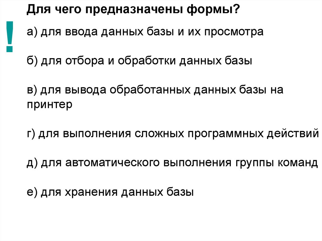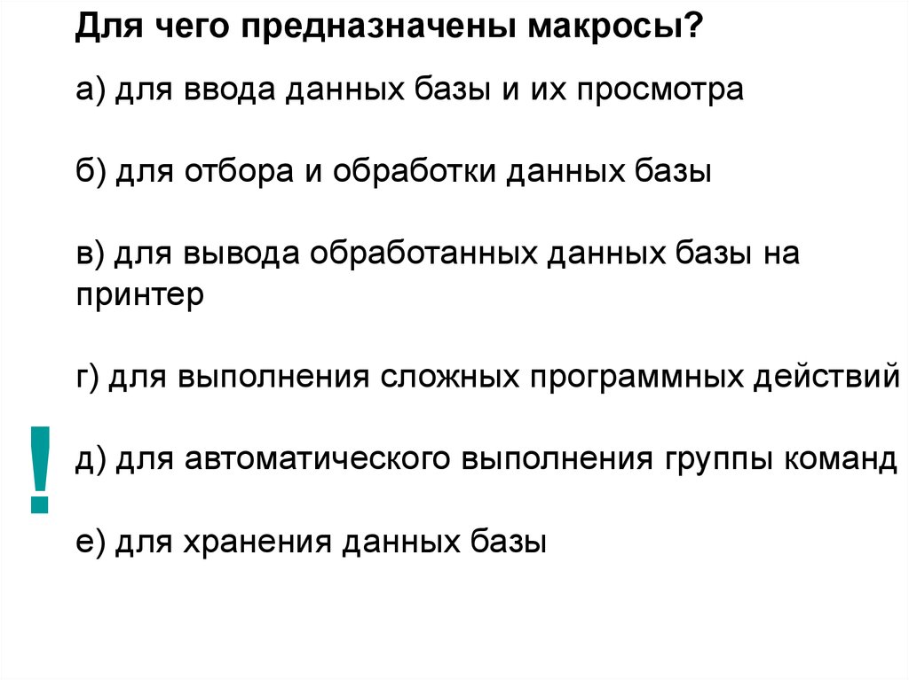 Для чего предназначены макросы?а) для ввода данных базы и их просмотра