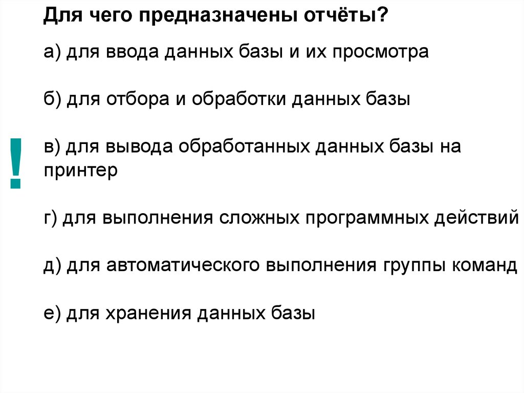 Для чего предназначены отчёты?а) для ввода данных базы и их просмотра