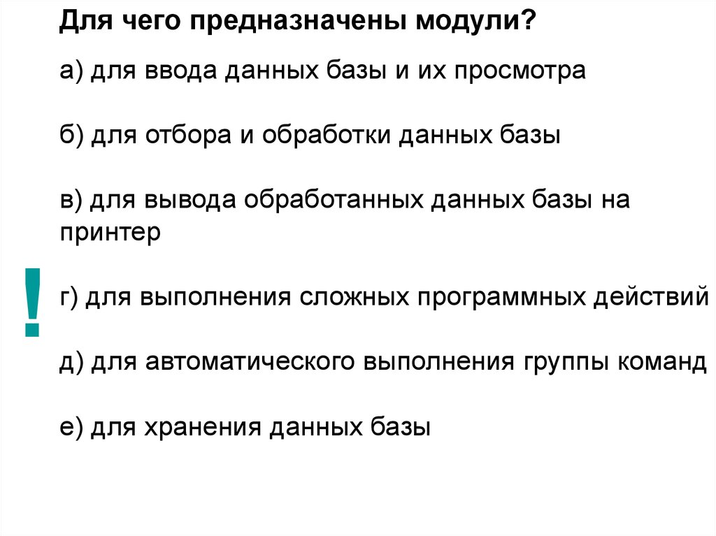 Для чего предназначены модули?а) для ввода данных базы и их просмотра