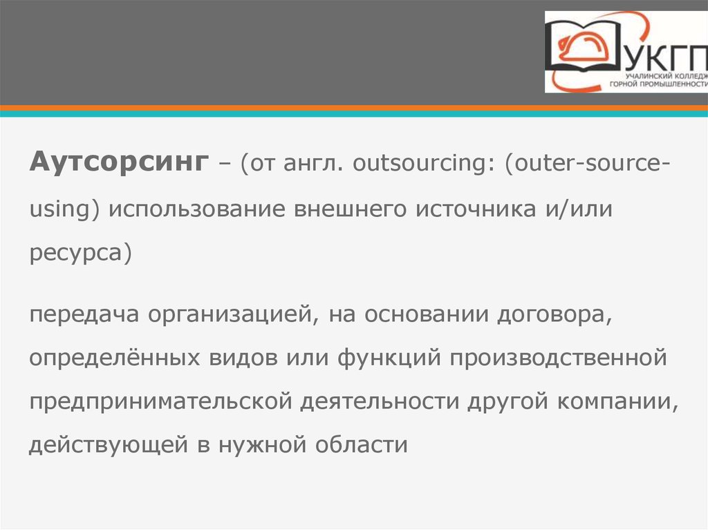 Аутсорсинг – (от англ. outsourcing: (outer-sourceusing) использование внешнего источника и/илиресурса)