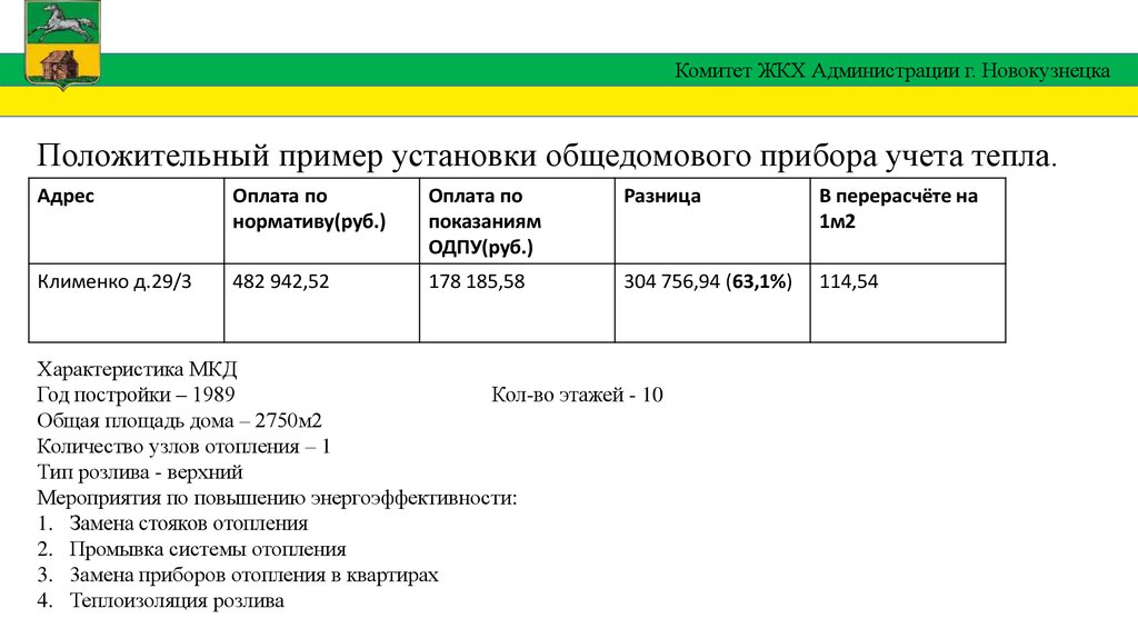 Комитет ЖКХ Администрации г. НовокузнецкаПоложительный пример установки общедомового прибора учета тепла.