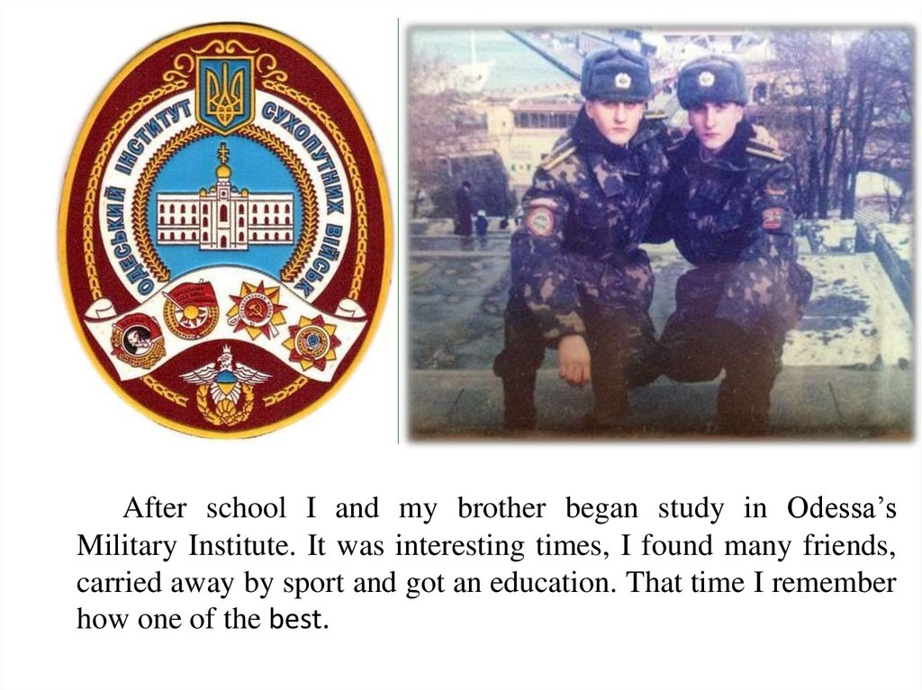After school I and my brother began study in Odessa’sMilitary Institute. It was interesting times, I found many friends,