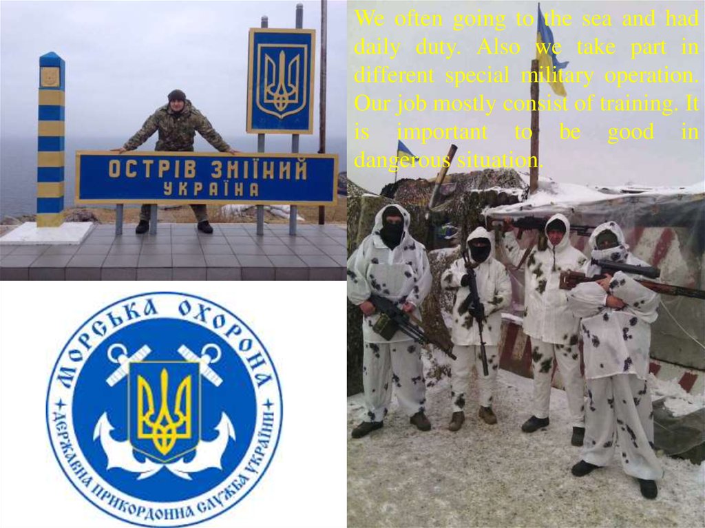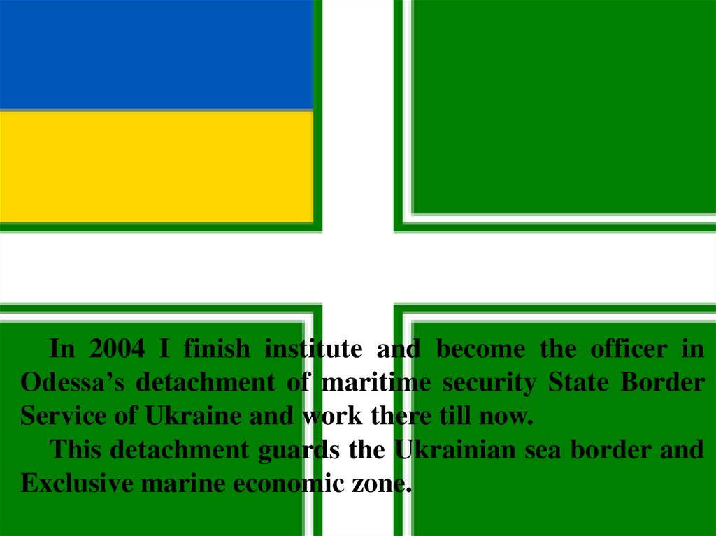 In 2004 I finish institute and become the officer inOdessa’s detachment of maritime security State Border