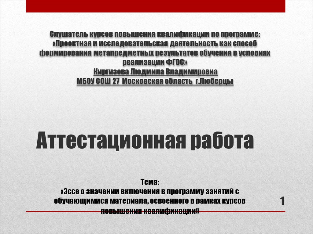 Слушатель курсов повышения квалификации по программе:«Проектная и исследовательская деятельность как способ