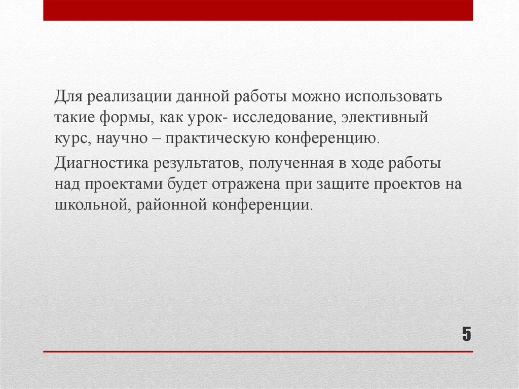 Для реализации данной работы можно использоватьтакие формы, как урок- исследование, элективный