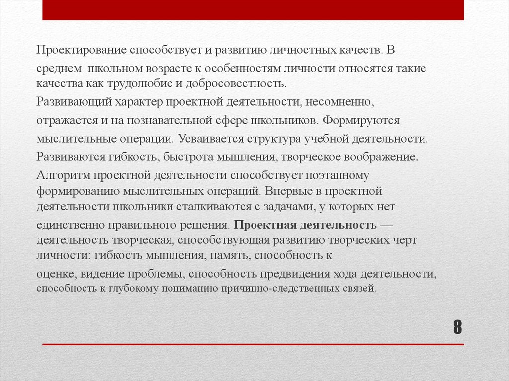 Проектирование способствует и развитию личностных качеств. Всреднем школьном возрасте к особенностям личности относятся такие